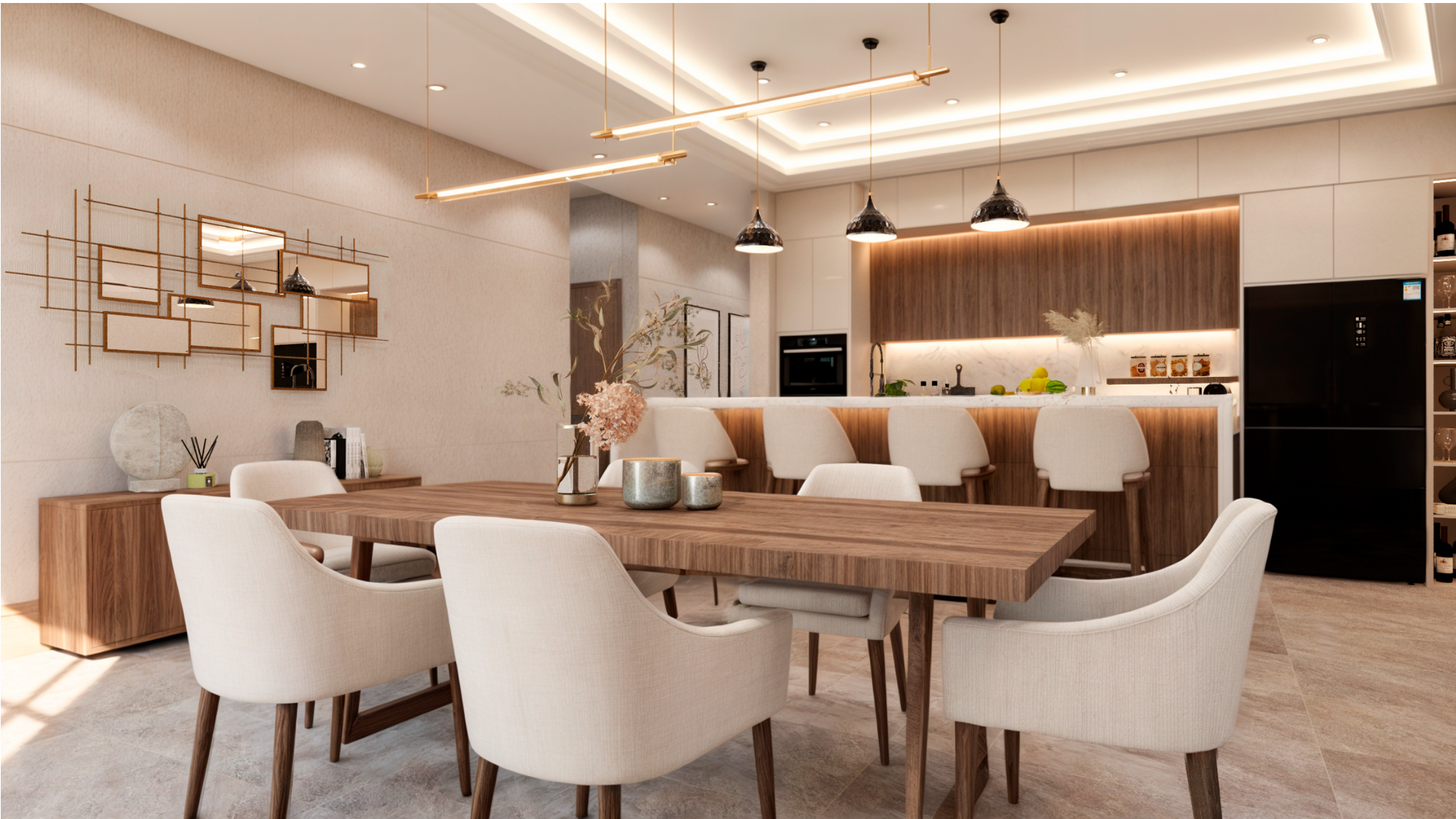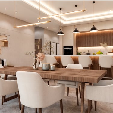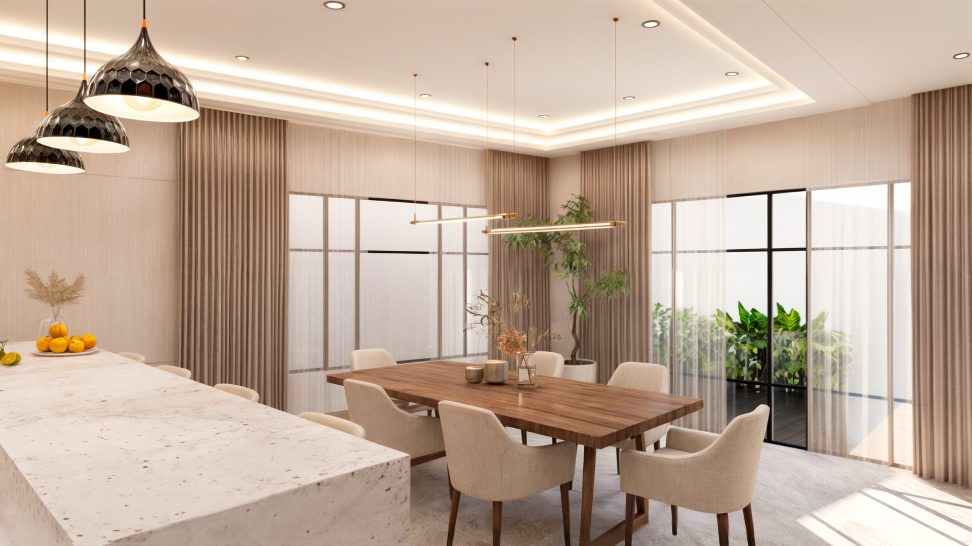 Comedor adyacente a la cocina, diseñado para maximizar las vistas y la comodidad durante las comidas.